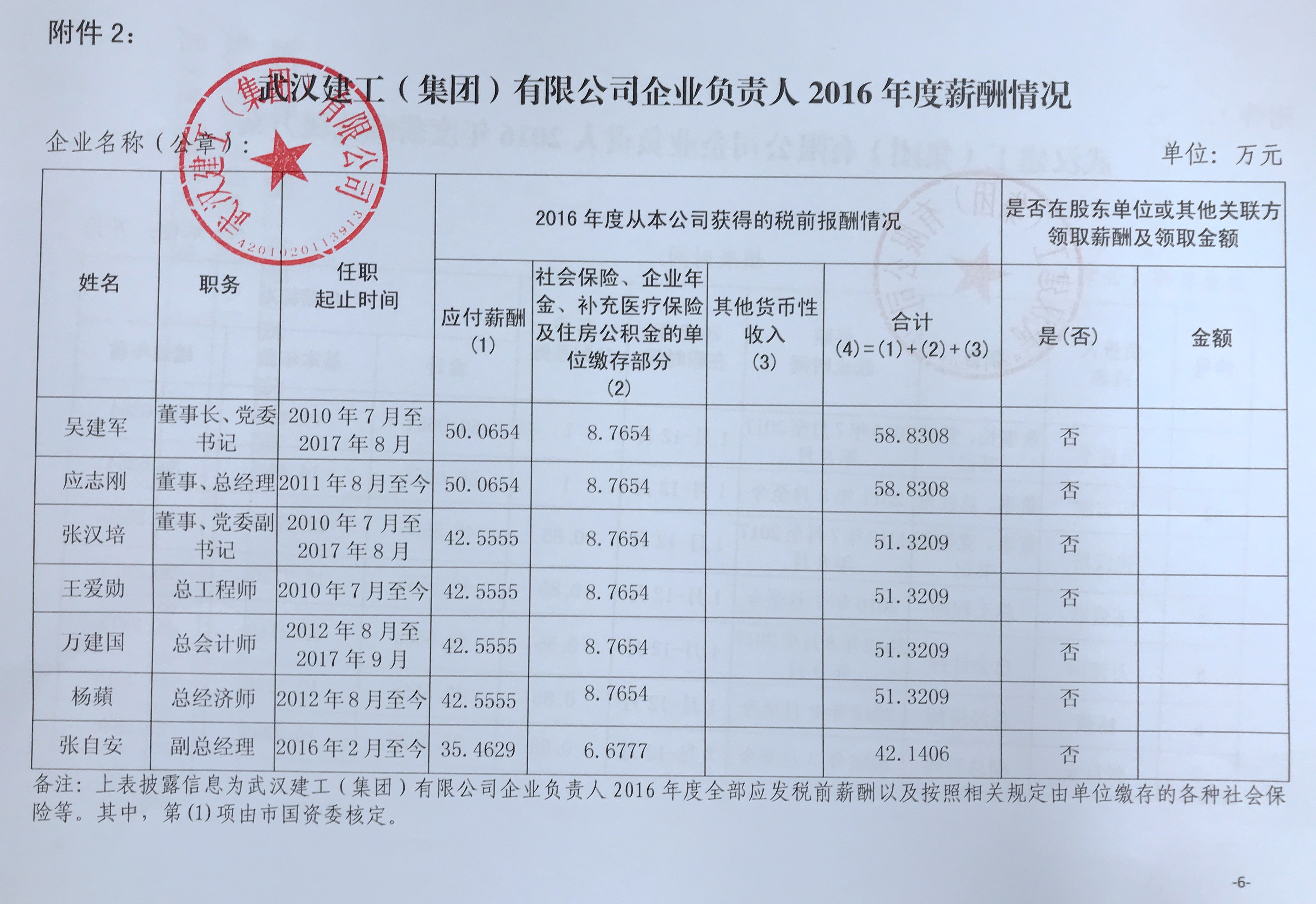 武漢建工(集團)有限公司企業(yè)負責人2016年度薪酬情況